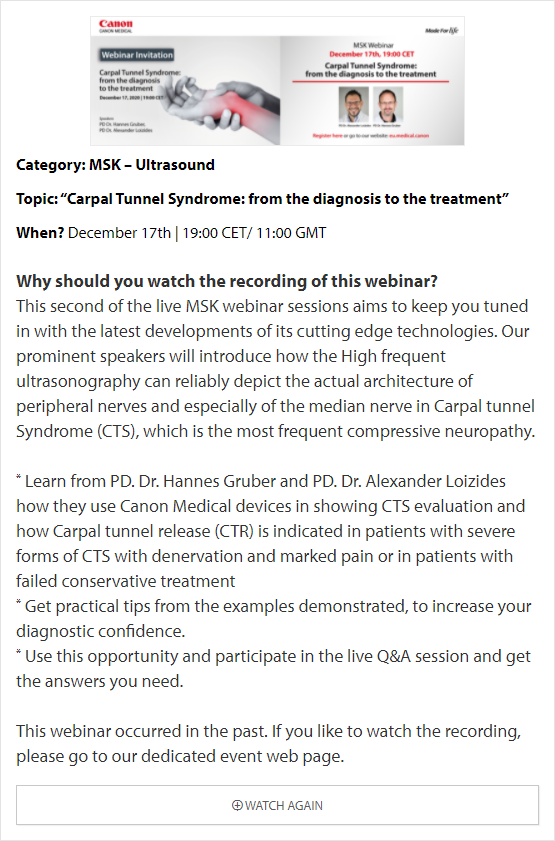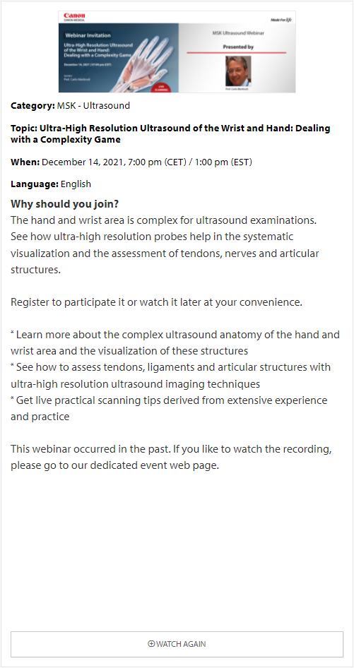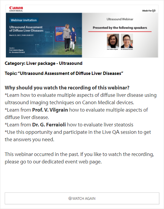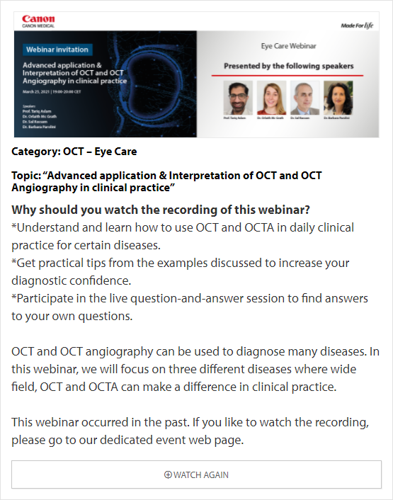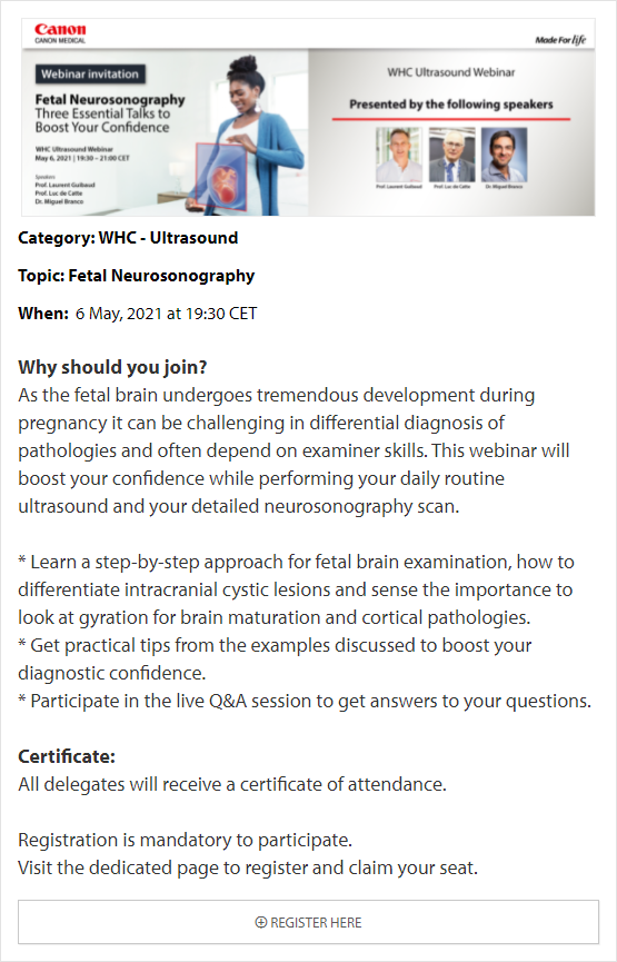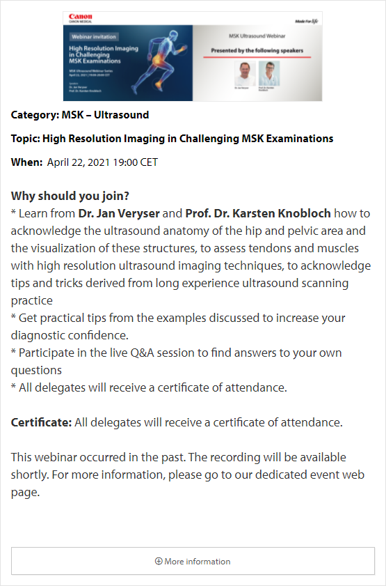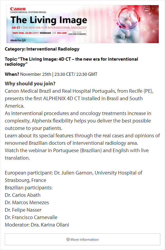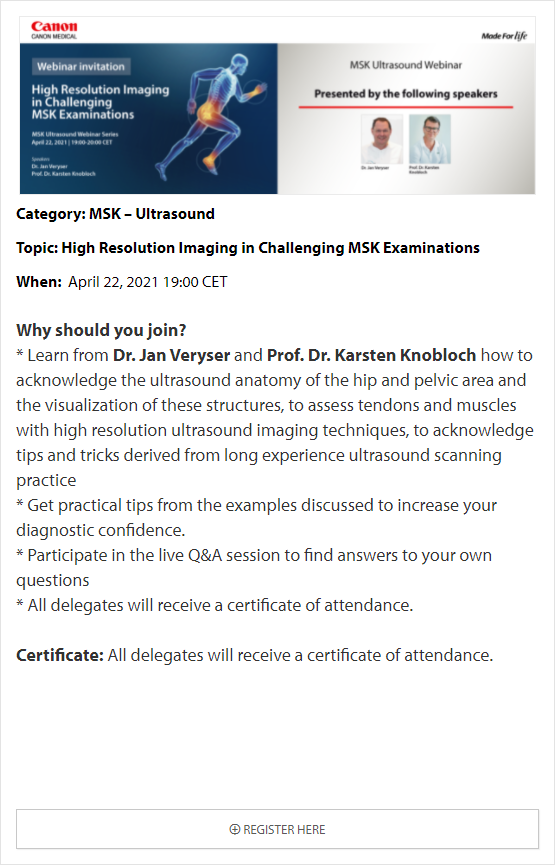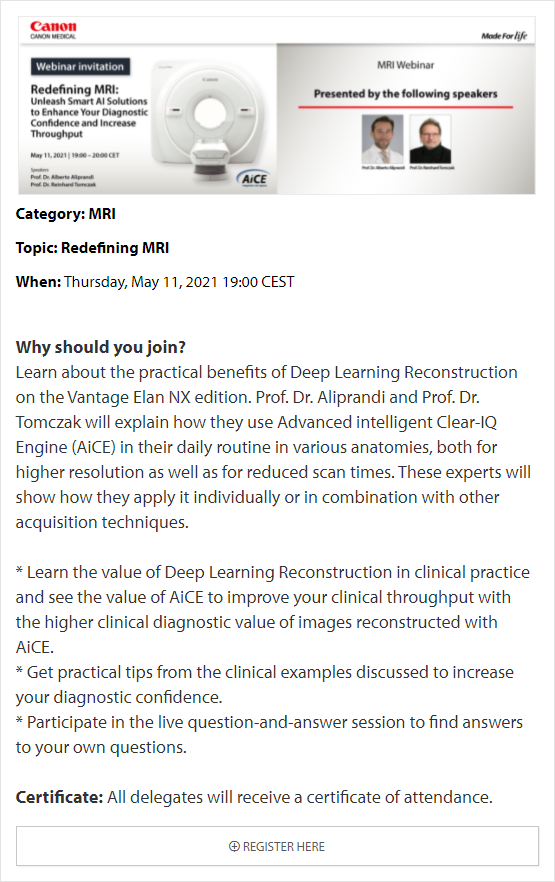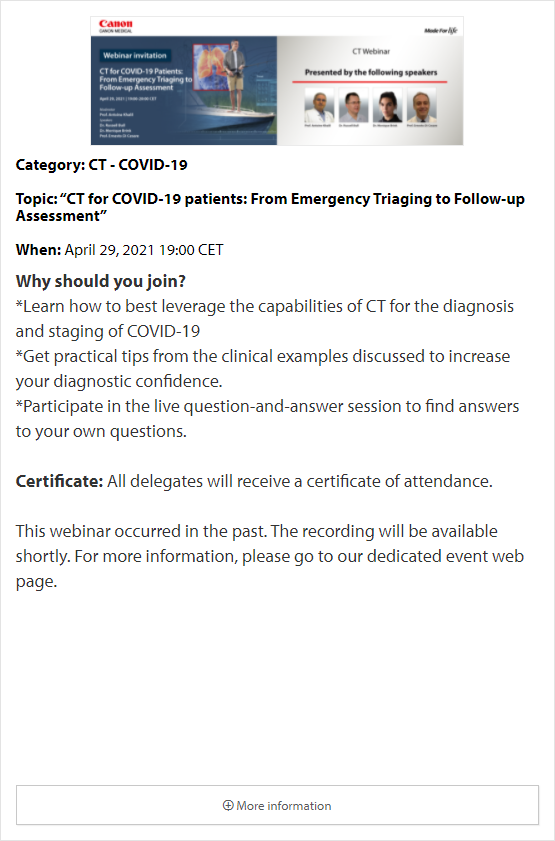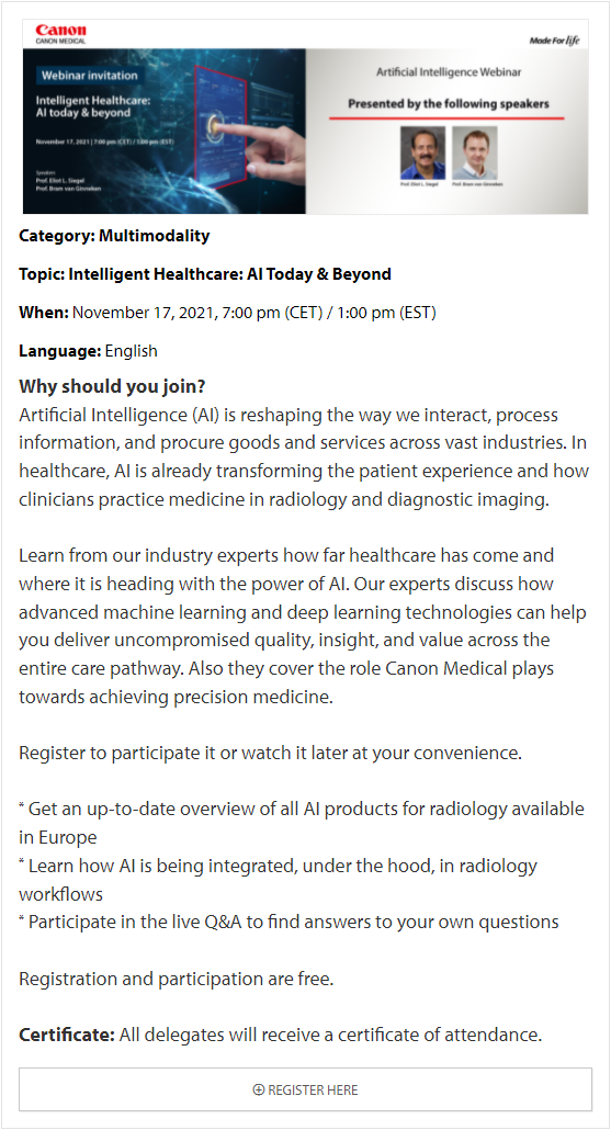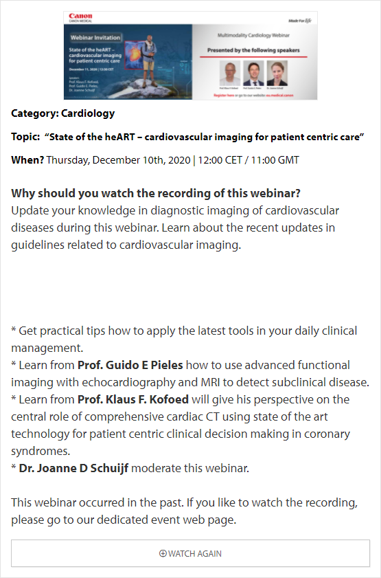 In these online educational webinars, leading experts share their expertise and exchange knowledge. Register to join one of our upcoming webinars. All delegates attending Canon Medical webinars are entitled to a certificate of attendance. The certificates will be provided to each individual delegate.